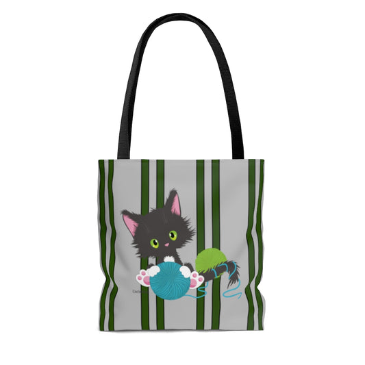 Grey Tuxedo Kitty Holding Ball of Yarn Cloth Tote Bag