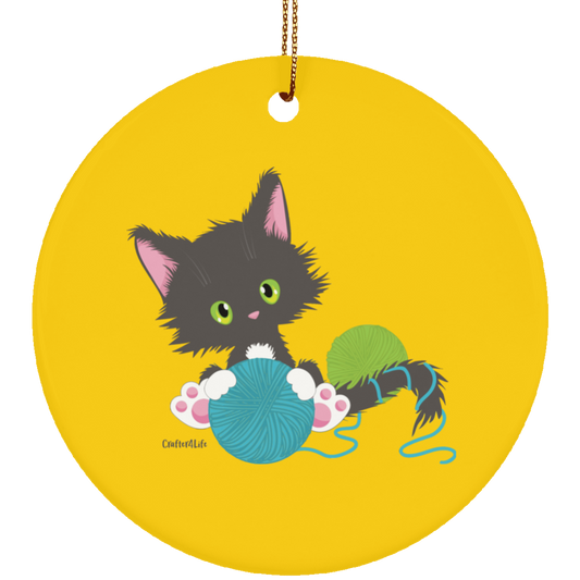 Grey Tuxedo Kitty Holding Ball of Yarn Ornaments