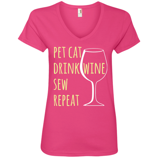 Pet Cat-Drink Wine-Sew Ladies V-Neck T-Shirt