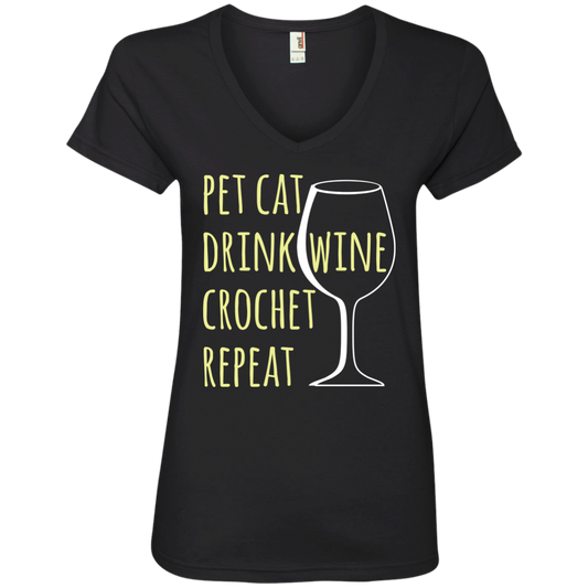 Pet Cat-Drink Wine-Crochet Ladies V-Neck T-Shirt