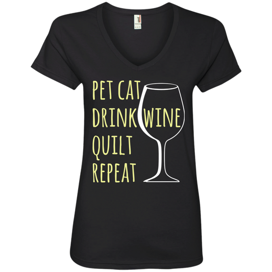 Pet Cat-Drink Wine-Quilt Ladies V-Neck T-Shirt