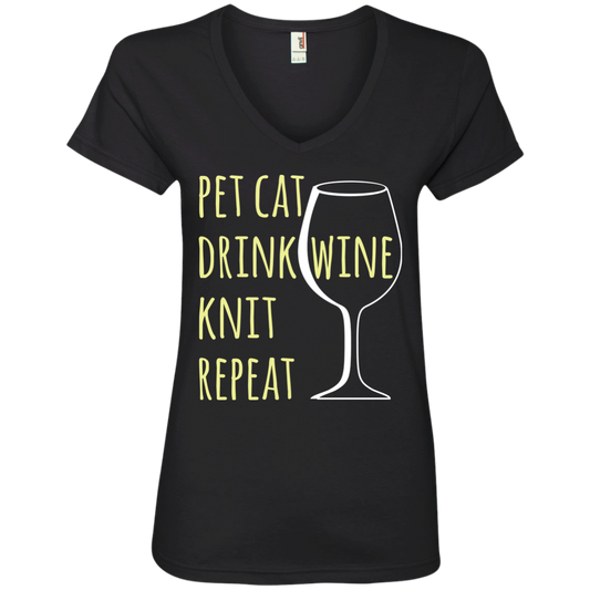 Pet Cat-Drink Wine-Knit Ladies V-Neck T-Shirt