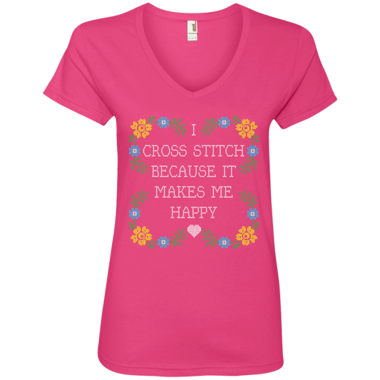 I Cross Stitch Because It Makes Me Happy Ladies V-neck Tee