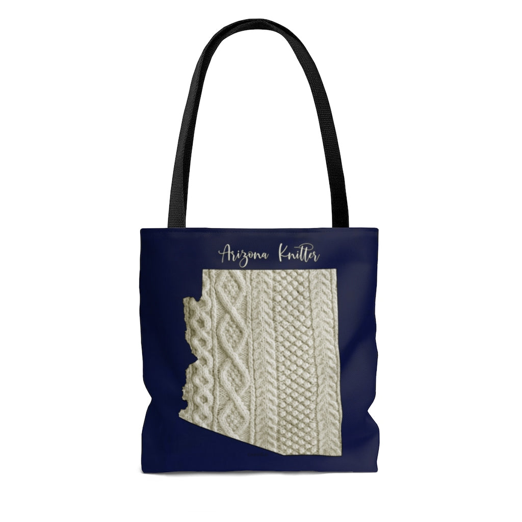 Love Knitting? Any Knitter from Arizona will love these tote bags! Perfect for shopping or projects, or to take to a knitting class or retreat. Makes a wonderful gift for any knitter in your life. Comes in 3 sizes for Small, Medium and Large knitting projects.