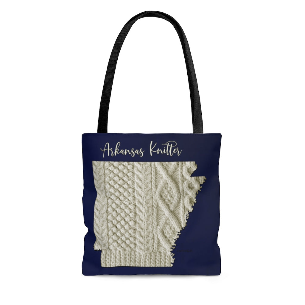 Love Knitting? Any Knitter from Arkansas will love these tote bags! Perfect for shopping or projects, or to take to a knitting class or retreat. Makes a wonderful gift for any knitter in your life. Comes in 3 sizes for Small, Medium and Large knitting projects.