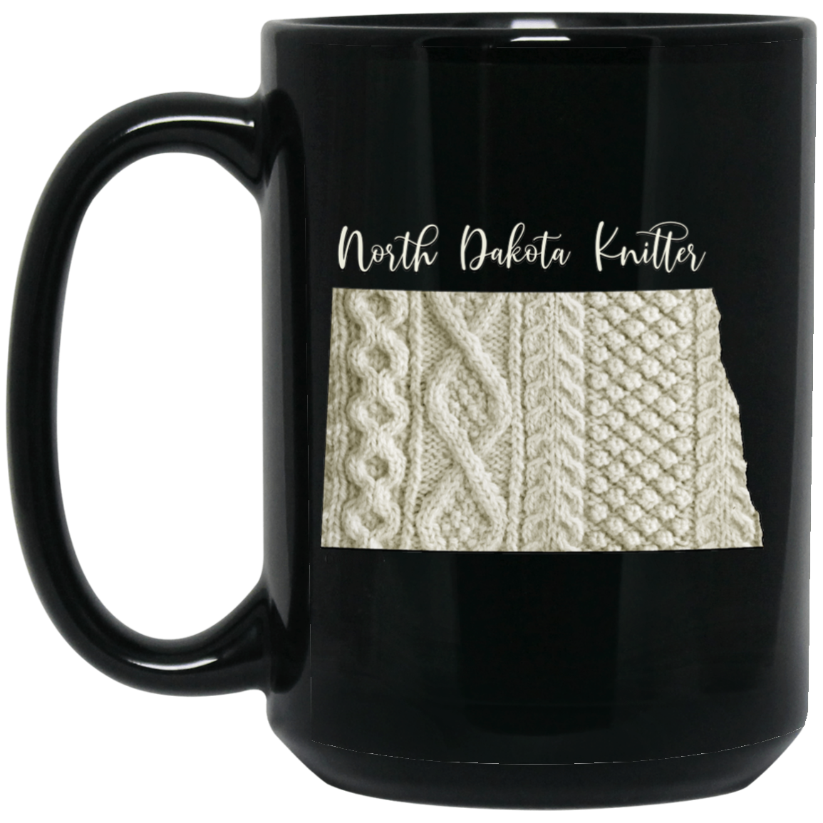 Featuring a vintage Irish knit sweater design in the shape of the state of North Dakota, this mug also makes a great gift for your knitting family and friends.